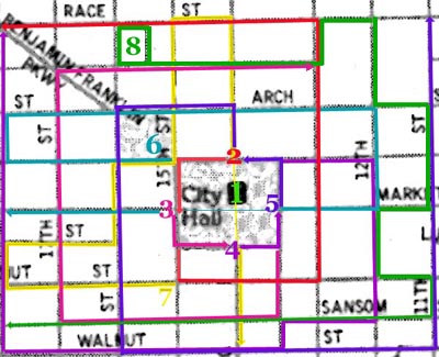 The map to the left is one possible way of working this out, a working template for visualizing what will happen, but individual capsulers may modify it beforehand. Each of the 7 capsulers on the ground will start at the location indicated by their number and head off along the colored line that matches their number. At the point that they pass out of the mapped area, they continue essentially in a straight line for as long as willng. So Capsuler "5," for example, the dark purple line, would continue North on 11th Street until at least Spring Garden, intersecting with another Capsuler's Route. Capsulers "2" and/or "4," after "meeting" at the Parkway, might continue out the Parkway to the Art Museum.