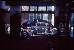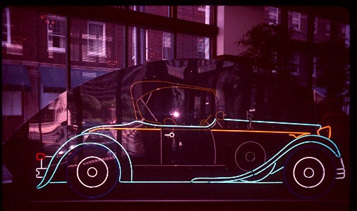 LEN DAVIDSON carried a tape recorder as he went about his day, including giving a bid on a neon job at a new bar, fixing these neon cars at the Packard building, and attending his men's group cookout/meeting in the evening. His book Vintage Neon had just come out and was the source of much discussion. |