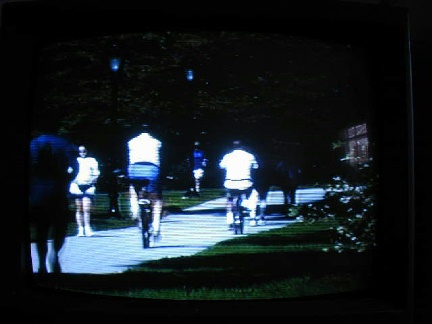 RON KANTER focused his lens on moving people around the Schuylkill River. His stationary camera records long scenes of pastoral settings through which people walk, run, skate and bike in a neverending stream. Starting at Falls Bridge and Kelly Drive, Ron records first the activity on the Kelly Drive path, then on the bridge in minutes-long takes. Then we get scenes from closer to town - this, that, the other. |